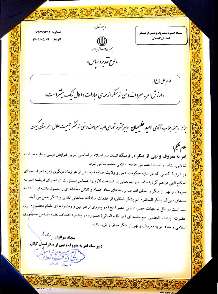 در گردهمایی دبیران شوراهای امر به معروف و نهی از منکر، معاونت امور جوانان جمعیت هلال احمر استان گیلان بعنوان دبیر شورای فرهنگی و شورای امر به معروف و نهی از منکر هلال احمر استان، بعنوان دبیر برتر منتخب و با اهدای لوح سپاسی توسط دبیر ستاد امر به معروف و نهی از منکر استان گیلان از زحمات و تلاش ایشان در زمینه تحقق اهداف و برنامههای ستاد تقدیر و تشکر به عمل آمد.